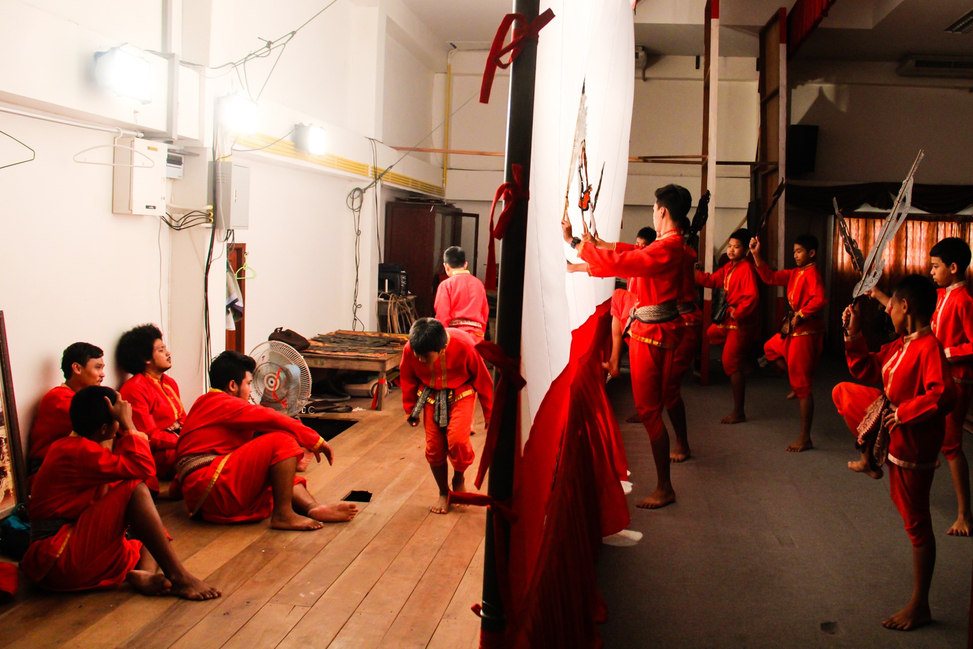 Sân khấu rất đơn giản và gần khán giả. Một nhóm nấp sau cánh gà bằng gỗ trong lúc chờ biểu diễn.