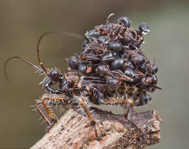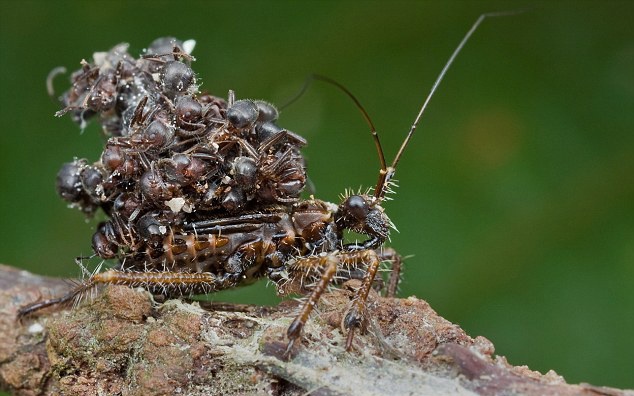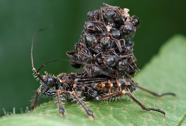 | Cận cảnh chiếc áo khoác bảo vệ sát thủ rệp. Sau khi rệp chích chất độc vào kiến. Chúng chất con mồi lên lưng để biến xác kiến thành chiếc áo bảo vệ. Nhiếp ảnh gia Guek Hock Ping (50 tuổi) ghi lại hình ảnh loài rệp sát thủ ở các khu rừng thuộc Penang và Selangor (Malaysia). Ảnh: Guek Hock Ping. |