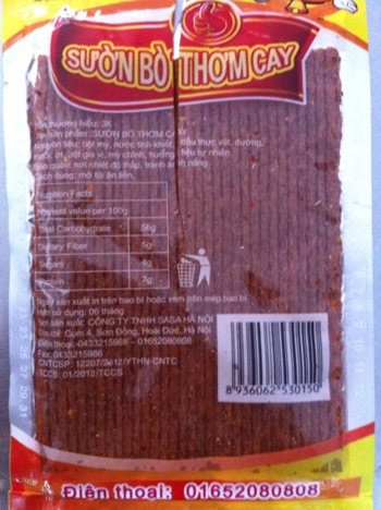 Sản phẩm mang tên "Sườn bò thơm cay", được quảng cáo là "Sản phẩm mới nhất tại Việt Nam", "Thơm ngon bổ dưỡng". Ở dưới cùng ghi một dòng chữ rất nhỏ "Snack làm từ bột mì". Sản phẩm này lại có hình dáng thuôn nhỏ như sợi bò khô. Ghi hạn sử dụng 6 tháng nhưng không ghi sản xuất từ ngày nào.