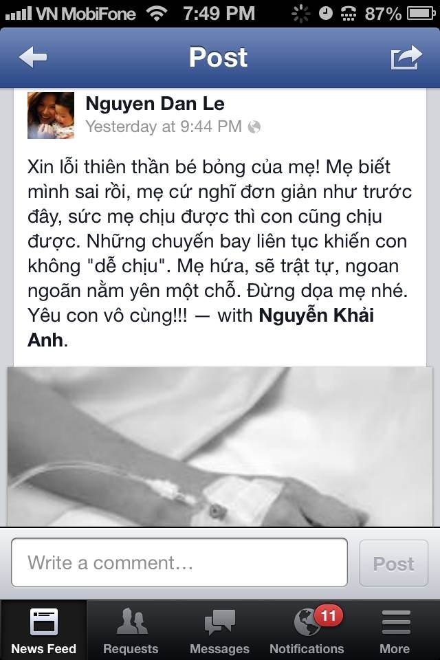 Cách đây không lâu, Đan Lê chia sẻ trên trang cá nhân hình ảnh mình đang phải truyền nước và những dòng tâm sự ăm ắp lo âu: "Xin lỗi thiên thần bé bỏng của mẹ! Mẹ biết mình sai rồi, mẹ cứ nghĩ đơn giản như trước đây, sức mẹ chịu được thì con cũng chịu được. Những chuyến bay liên tục khiến con không "dễ chịu". Mẹ hứa, sẽ trật tự, ngoan ngoãn nằm yên một chỗ. Đừng dọa mẹ nhé. Yêu con vô cùng...".