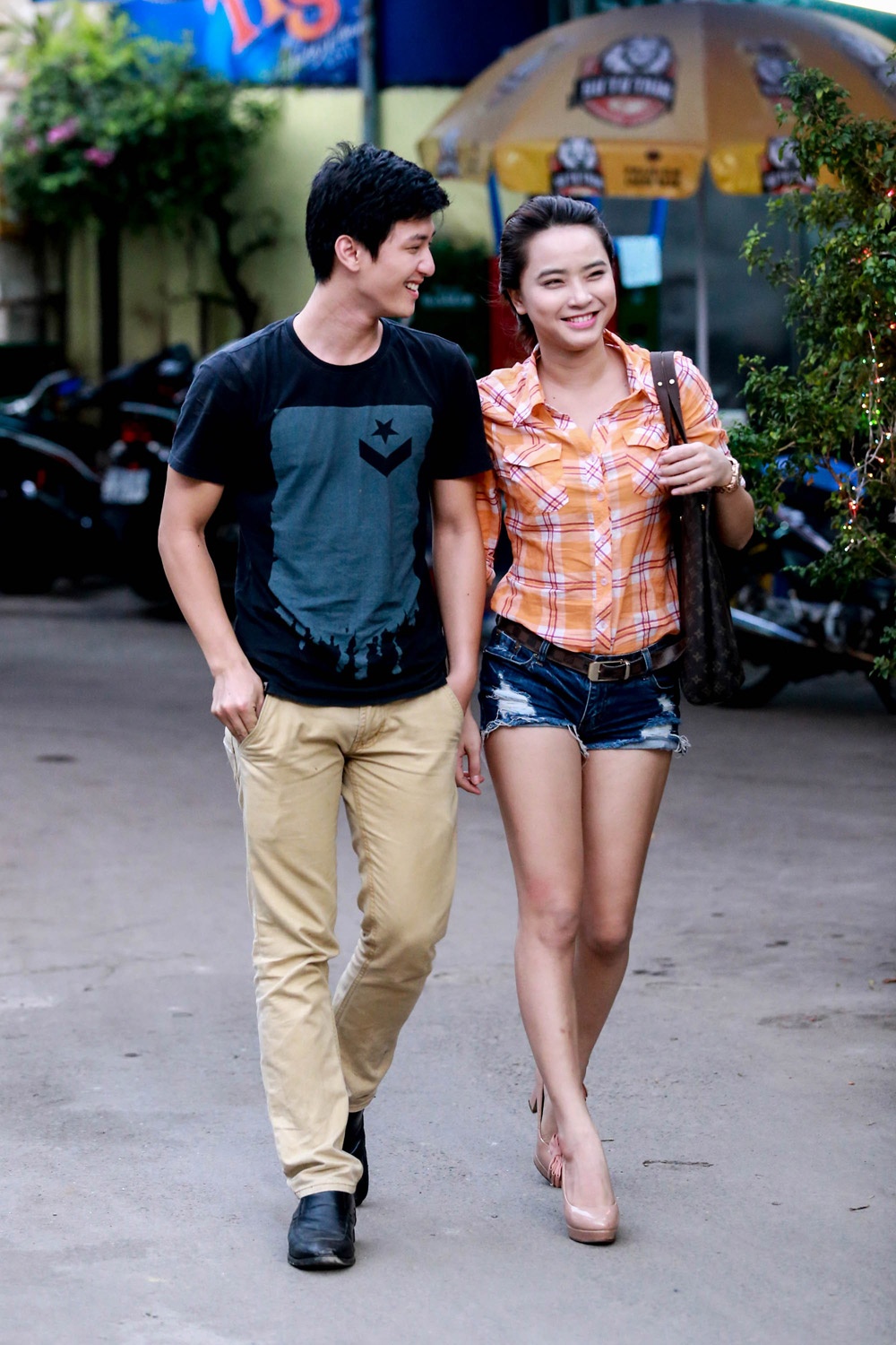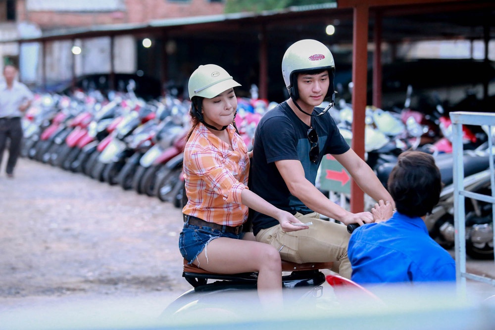| Huỳnh Anh chăm sóc Hải Băng chu đáo. Anh buộc dây nón bảo hiểm cho Hải Băng như một đôi uyên ương thực sự. |