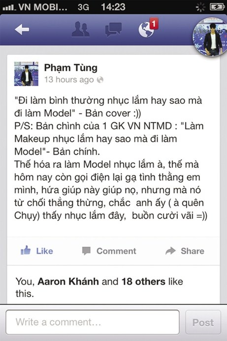Trên trang cá nhân được cho là của người mẫu Phạm Tùng, thí sinh tham gia vòng sơ tuyển cuộc thi này, xuất hiện những dòng chia sẻ: “Làm make-up nhục lắm hay sao mà làm người mẫu. Thế mà hôm nay còn gọi điện thoại gạ tình thằng em mình, hứa giúp này giúp nọ”.