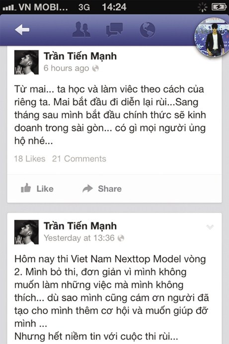 Trên trang cá nhân được cho là của Trần Tiến Mạnh, ngày 12/8, xuất hiện dòng chia sẻ: “Cuộc sống nó bất công lắm, không có quan hệ bị dìm ngay, ức mà không nói nên lời”. Hôm sau, thí sinh này lại tiếp tục viết: “Hôm nay Vietnam’s Next Top Model đến vòng 2. Mình bỏ thi, đơn giản vì mình không muốn làm những việc mình không thích, hết niềm tin với cuộc thi rồi”.