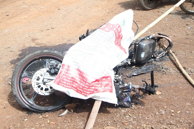 Theo ghi nhận của phóng viên, tại hiện trường chiếc xe máy bị đốt cháy rụi, trơ khung sắt. Cạnh đó là nhiều gậy gộc, bao tải bên trong chứa dây thòng lọng có cán cầm nối với dây điện dùng để bắt chó, một cục pin quấn bằng băng keo đen có dây điện, ná cao su, nhiều gói bột ớt, băng keo đen.