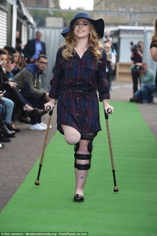 | Mặc dù chỉ còn một chân, Vicky Balch vẫn tự tin trình diễn thời trang. |