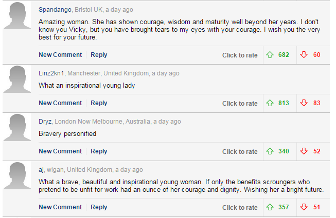 Nghị lực sống và sự lạc quan của Vicky Balch khiến cộng đồng mạng cảm phục. Một bạn trẻ có nickname Spandango nhận xét: “Bạn là cô gái tuyệt vời. Lòng dũng cảm, trí tuệ và sự trưởng thành của bạn vượt xa độ tuổi hiện tại. Tôi không biết bạn, nhưng sự can đảm này khiến tôi rơi nước mắt. Chúc bạn gặp nhiều điều tốt đẹp trong tương lai”.