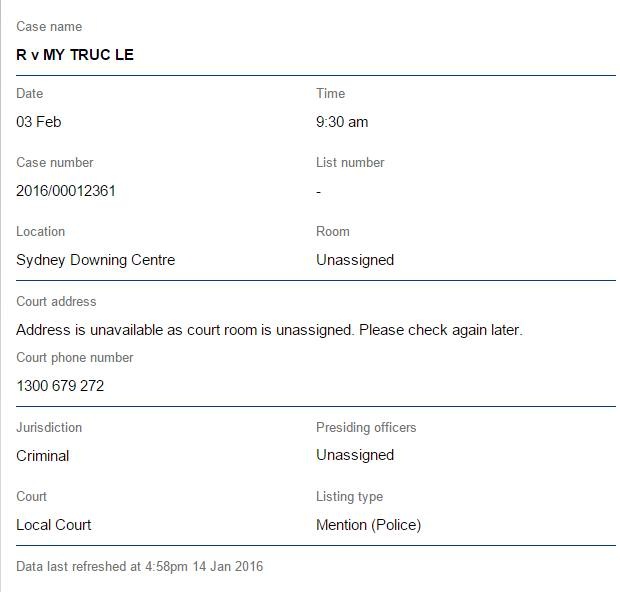 Trên trang điện tử của Tòa án bang New South Wales, thông tin vụ xét xử My Truc Le, nghi phạm trong vụ lừa đảo vé máy bay rúng động cộng đồng sinh viên Việt Nam tại Australia đã được công bố. Theo đó, vụ án sẽ được xét xử vào 9h30 ngày 3/2 (giờ địa phương). Hồ sơ xét xử của My Truc Le mang số 2016/00012361.