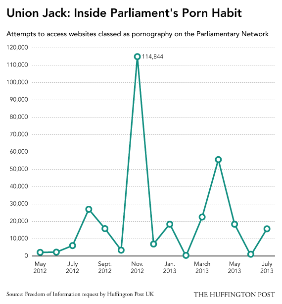Theo biểu đồ mà Huffington Post cung cấp, nghị sĩ Anh và nhân viên trong Quốc hội truy cập web khiêu dâm 114.844 lần trong tháng 11/2012, nhiều nhất trong khoảng thời gian từ tháng 5/2012 đến tháng 7/2013. Trong khi đó, tháng 2/2013 chỉ có 15 lần.