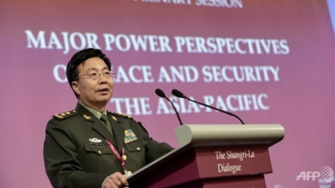 | Phó tổng tham mưu trưởng Quân đội Trung Quốc Vương Quán Trung không giải thích được "đường lưỡi bò" tại Đối thoại Shangri-La 13. Ảnh: AFP. |