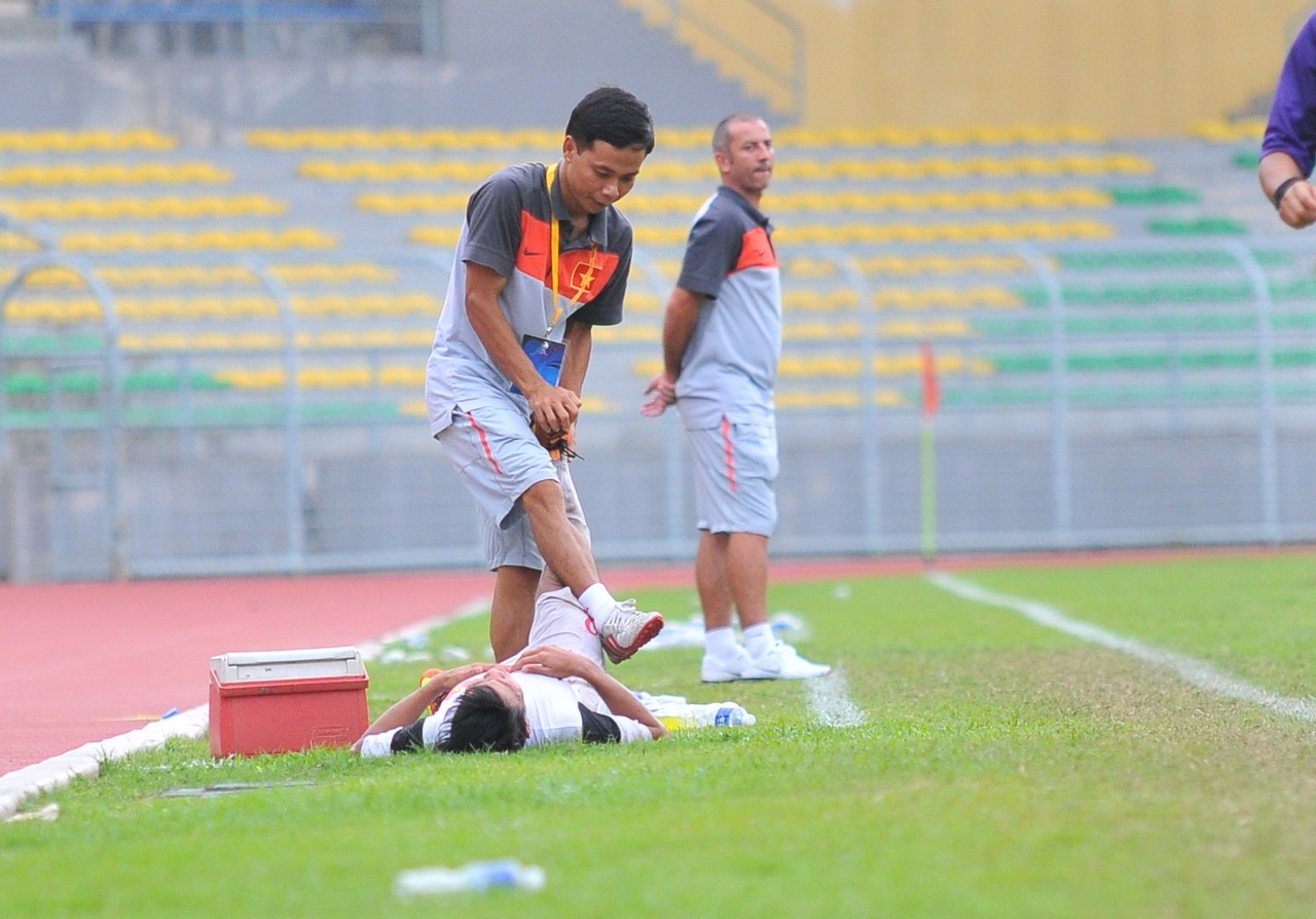| Tiền vệ trái Đức Huy bị vào bóng ác ý phải rời sân ở cuối hiệp 1. |