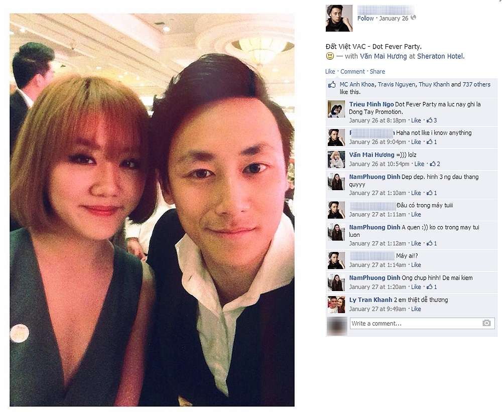 | Trên trang cá nhân của Hưng Long, anh từng chia sẻ hình ảnh cùng đi dự tiệc với Văn Mai Hương. Văn Mai Hương cũng thường xuyên nhấn nút like cho các chia sẻ của Hưng Long trên trang cá nhân. Đây là thói quen của cô khi chưa công khai chuyện tình cảm với Lê Hiếu. |