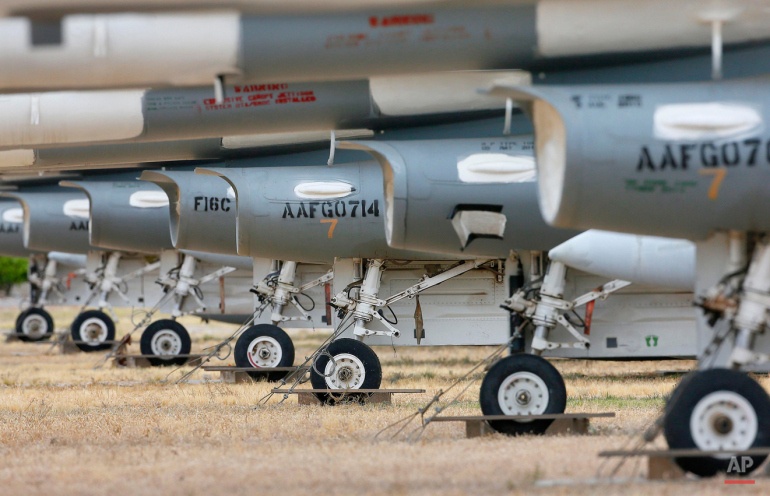 Chiến đấu cơ lừng danh F-16 Fighting Falcons được bọc trong một lớp sơn đặc biệt để phi cơ không hỏng. Đây là mẫu máy bay phổ dụng nhất của phương Tây. Không quân Mỹ đã ngừng mua F-16. Kỹ sư sửa chữa và lắp hệ thống điều khiển từ xa trên những phi cơ F-16 mà quân đội loại khỏi biên chế để chúng trở thành máy bay mục tiêu. |