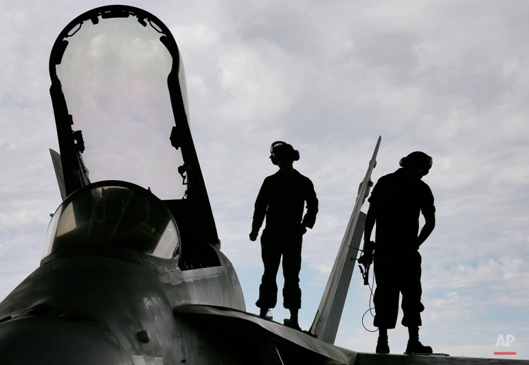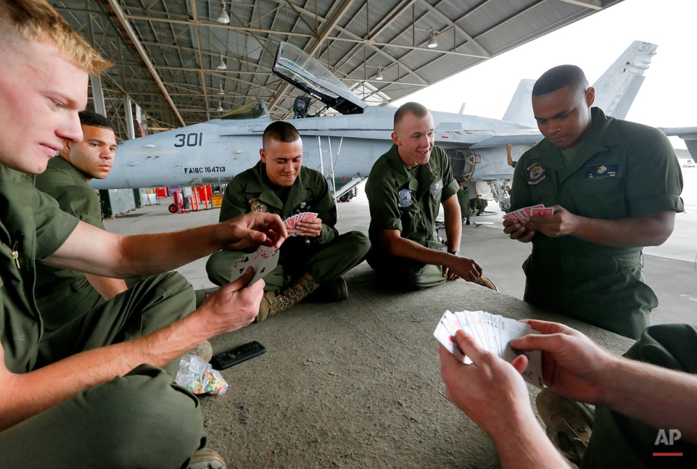 Lính Mỹ đánh bài trong thời gian nghỉ giải lao. Họ đang sửa một chiếc F/A-18, máy bay chuyên trách trên tàu sân bay, để nó có thể hoạt động trở lại. |