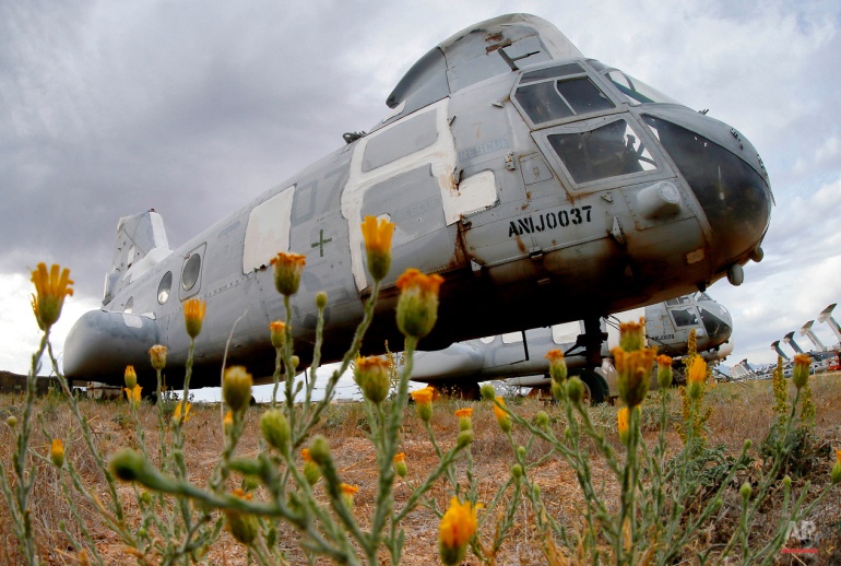 Một phi cơ CH-46 Sea Knight không còn cánh quạt. Nó nằm nhiều năm ở nghĩa địa nhưng vẫn chưa tới lượt "hóa kiếp". |