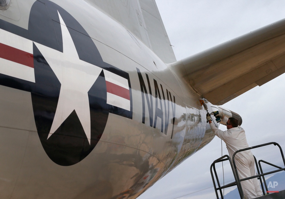 Một máy bay tuần thám, săn ngầm P-3C Orion của Hải quân Mỹ. Nhân viên nhóm 309 đang buộc dây cáp vào vị trí gần cánh đuôi máy bay. |