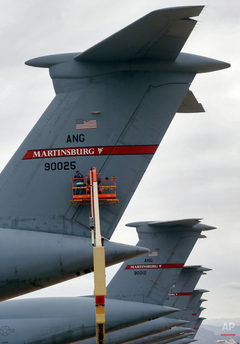 Công nhân lắp khóa cánh lái trên đuôi một máy bay vận tải chiến lược Lockheed C-5 Galaxy. |