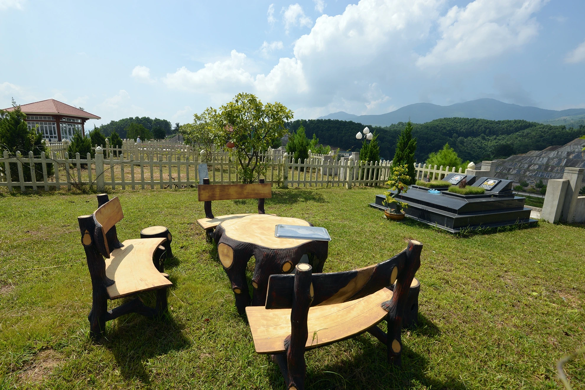 | Nhiều nơi được bố trí bàn uống nước bằng gỗ thơm, xích đu để người nhà khi viếng mộ có thể ngồi uống trà, nghỉ ngơi. Bên ngoài khuôn viên là bể chứa nước ngầm và một nhà vệ sinh lưu động. Một khu mộ như vậy, trị giá vài tỷ đồng. |