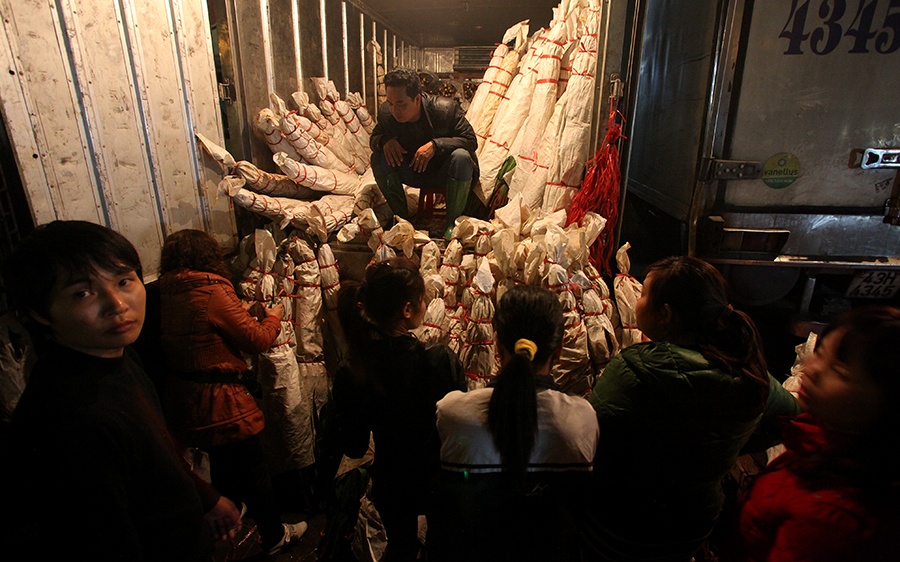 Nhiều người dân ở những tỉnh lân cận như Hải Dương, Hải Phóng, Hưng Yên... cũng tìm về chợ từ mờ sáng để mua về đổ buôn.