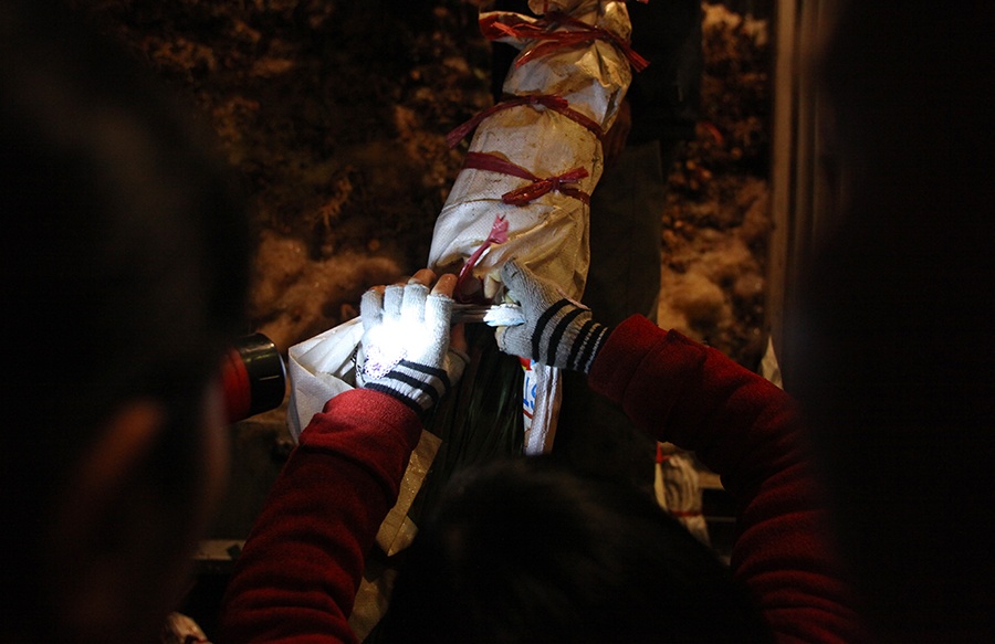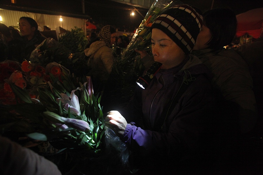 Mỗi lái buôn đến chợ đều trang bị một chiếc đèn pin để kiểm tra màu hoa và độ dập nát.
