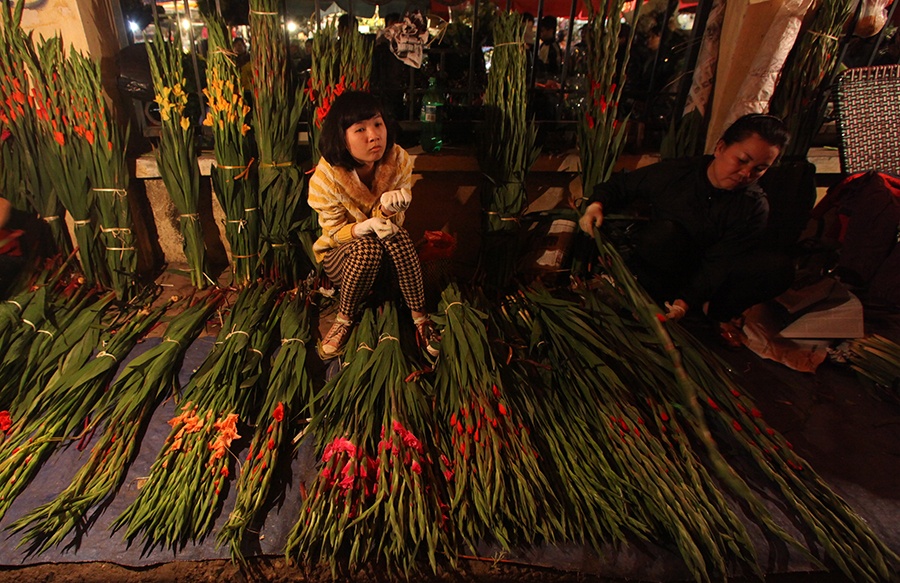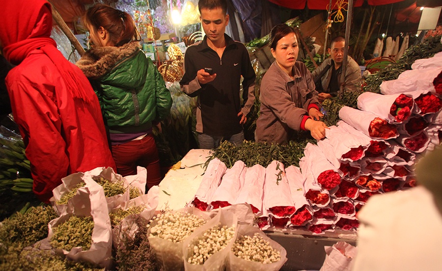 Cái rét đêm của mùa đông Hà Nội kèm chút sương muối không làm ảnh hưởng nhiều đến công việc của người bán hoa.