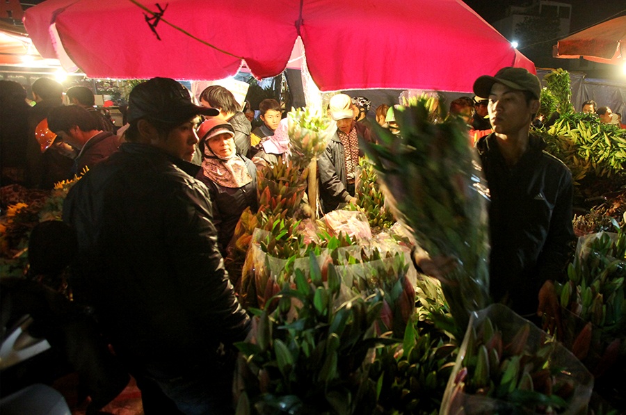 2h sáng 29/1, chợ hoa Quảng An, quận Tây Hồ tấp nập người qua lại. Giá cả vẫn như Tết năm trước, có những cuộc mua bán nhanh chóng tới mức chủ và khách còn chưa kịp nhìn mặt nhau.
