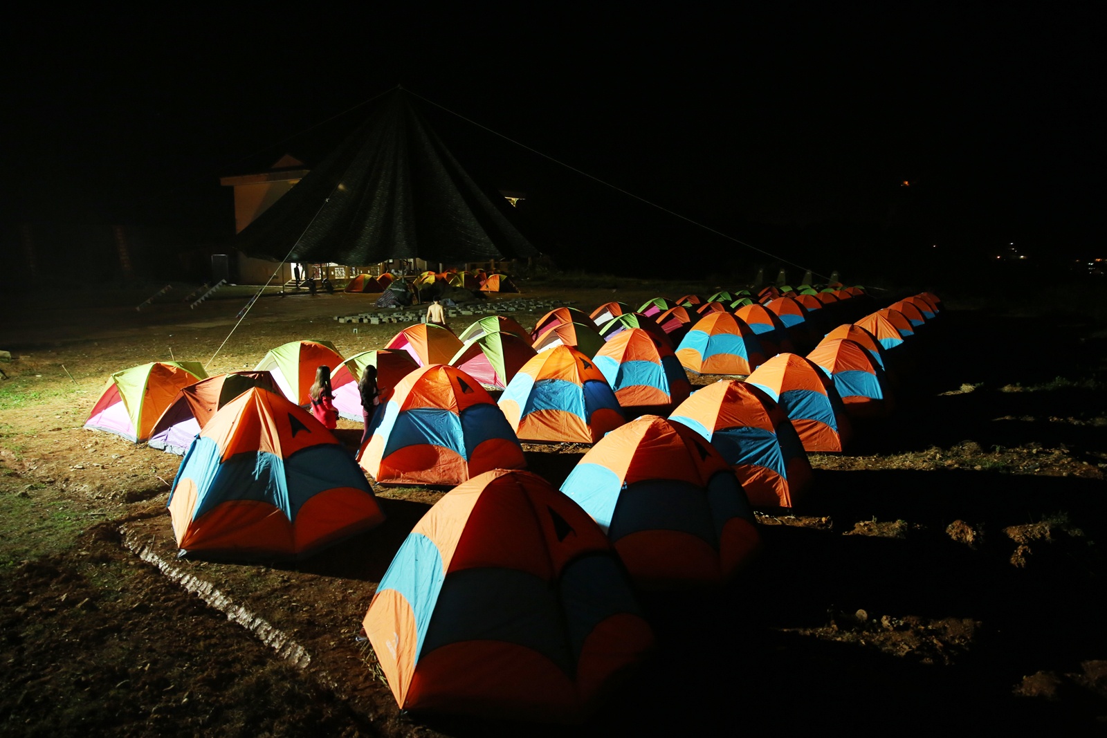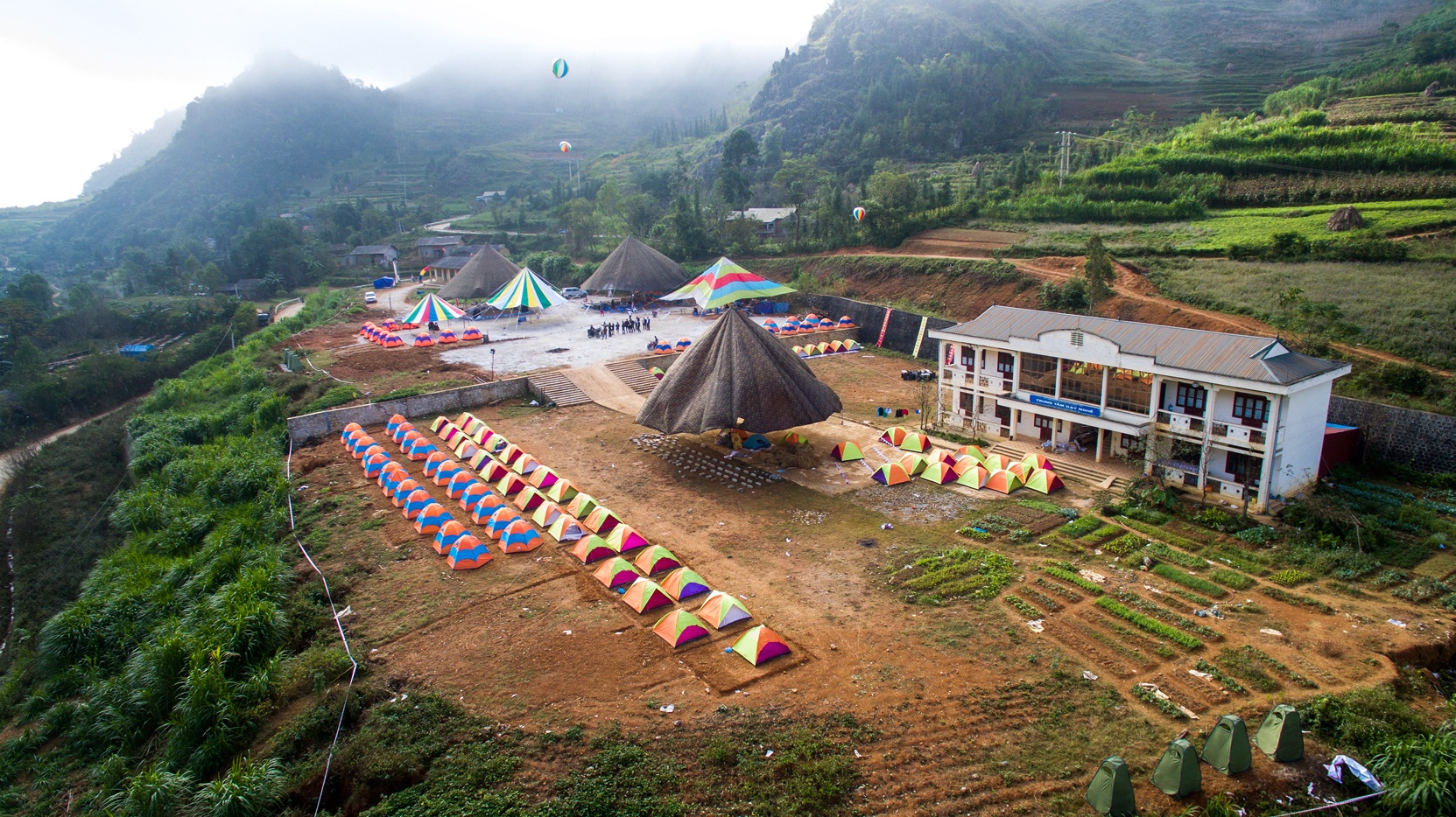 | Những chiếc lều bạt nhiều màu sắc được dựng trong khuôn viên Trường nghề Đồng Văn, cách chợ Đồng Văn khoảng 1 km. |