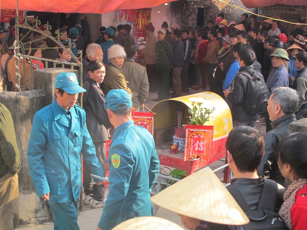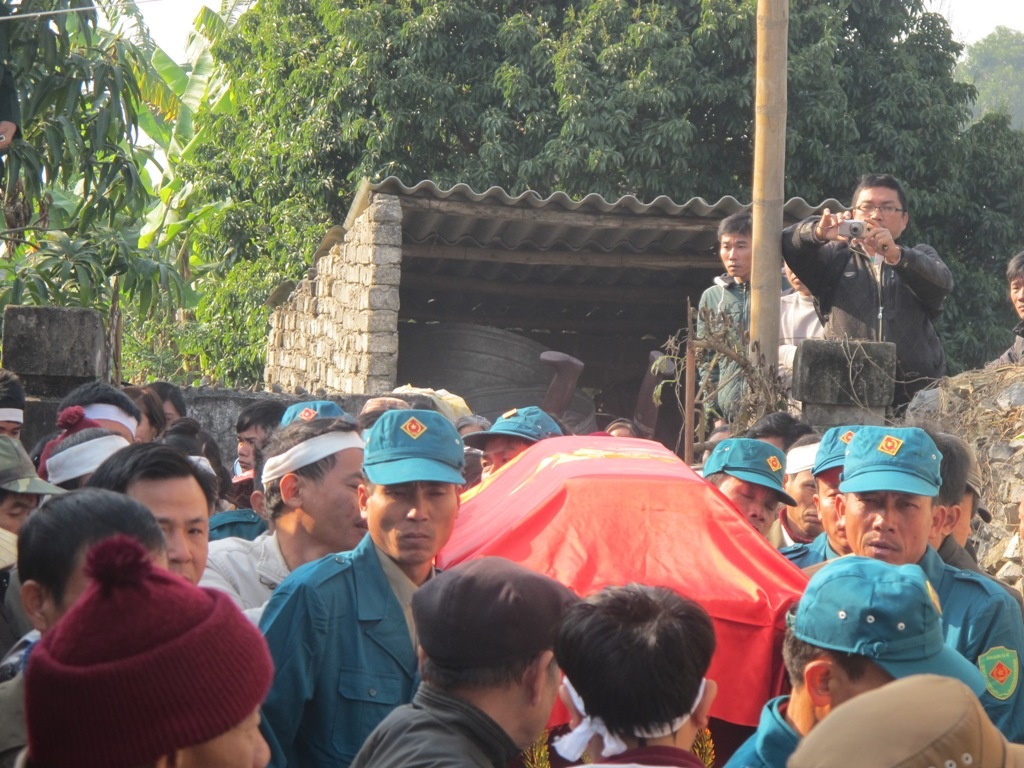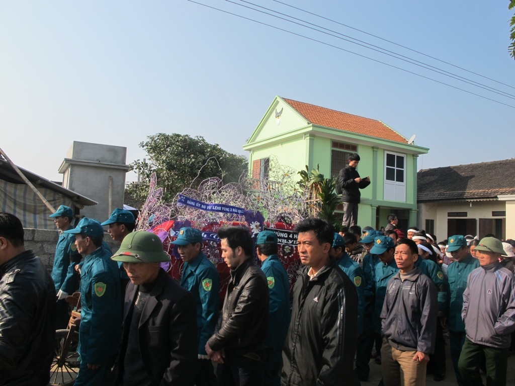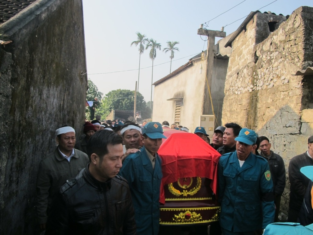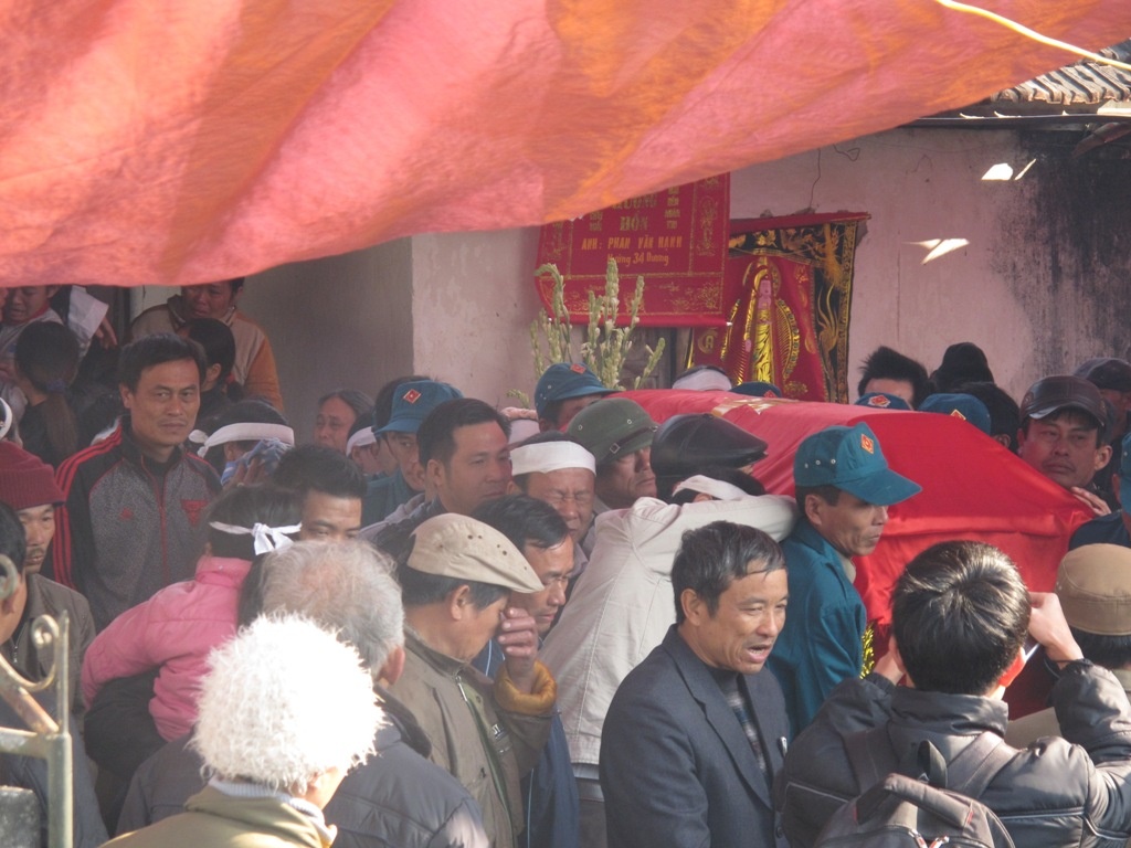 Quan tài được các dân quân tự vệ khiêng ra khỏi ngõ, rất đông người dân đứng xung quanh.