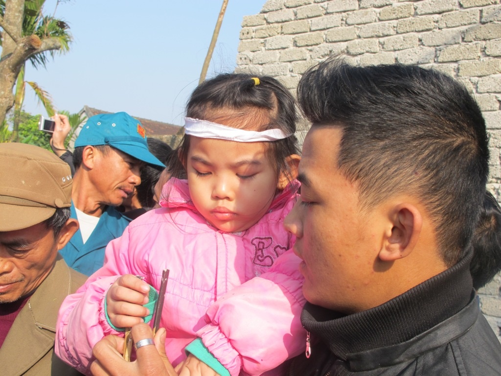 | Cháu Phan Thị Thùy Dương (5 tuổi, con anh Hạnh) chưa cảm nhận được nỗi đau mất bố. Cháu ngơ ngác khi được người chú bế đi đưa tang. |