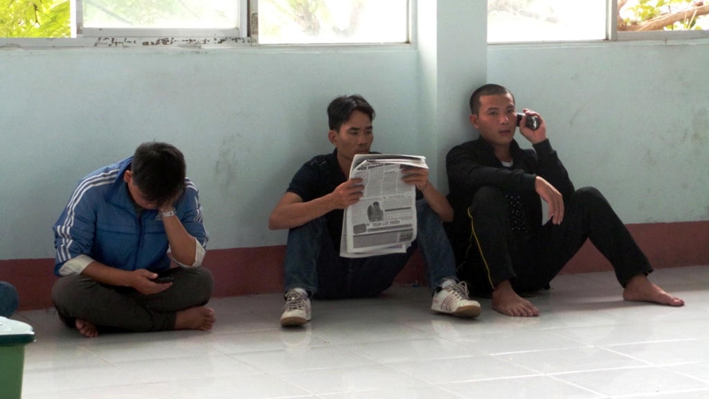 | Những người lên sau không có chỗ ngồi đành ngồi bệt dưới nền nhà chờ đợi tới lượt mua vé. |