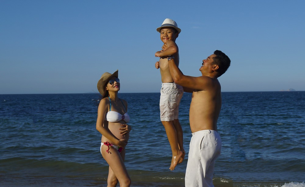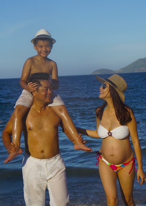 | Nhân dịp nghỉ hè, vợ chồng Ngô Mai Trang và doanh nhân Đỗ Hoàng Dương cùng con trai lớn nghỉ dưỡng tại Nha Trang. Cả gia đình có kỳ nghỉ vui vẻ trước khi cô lâm bồn đầu tháng 8. |