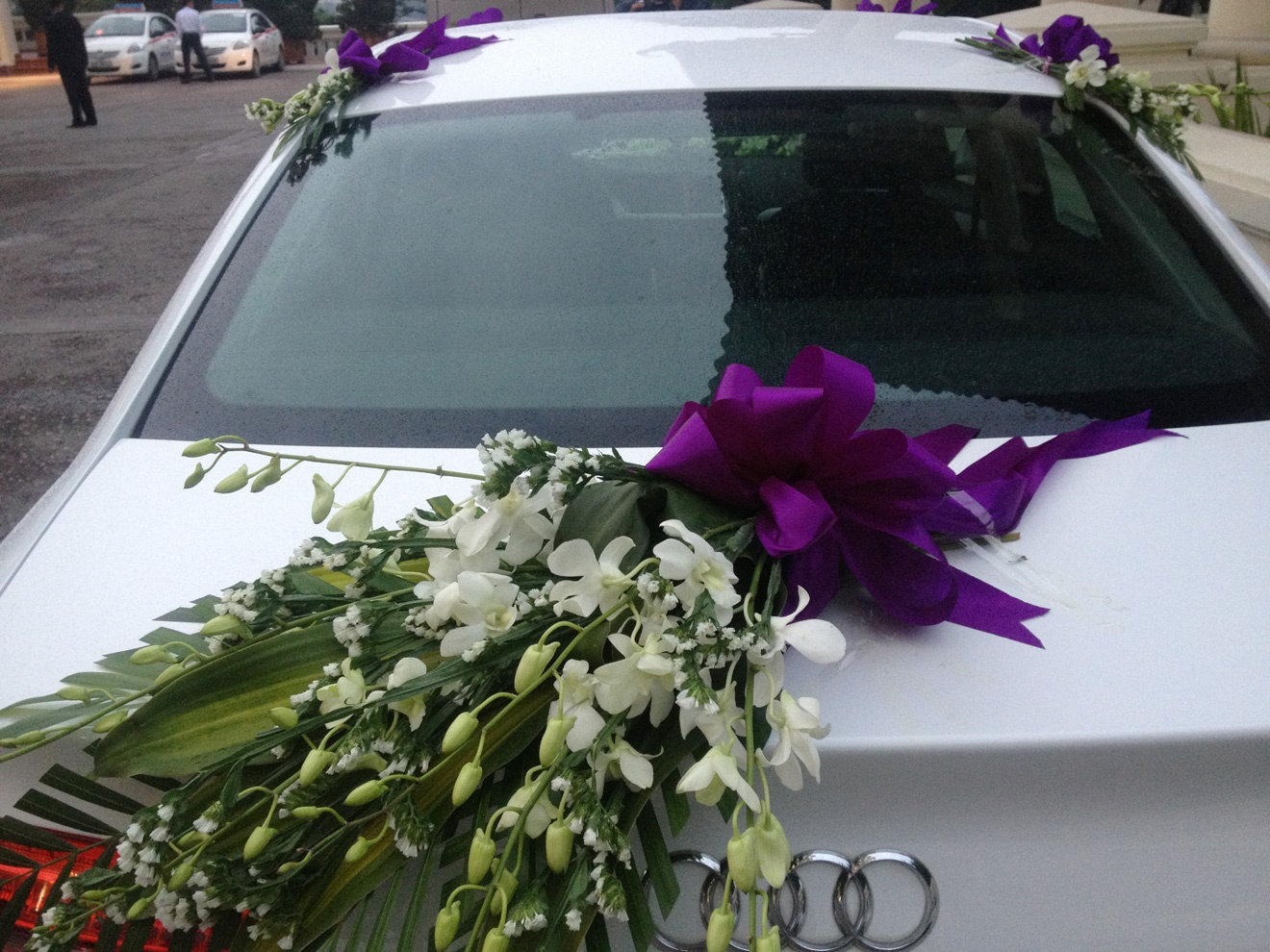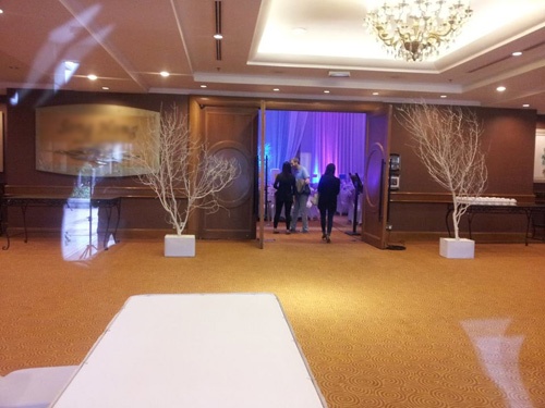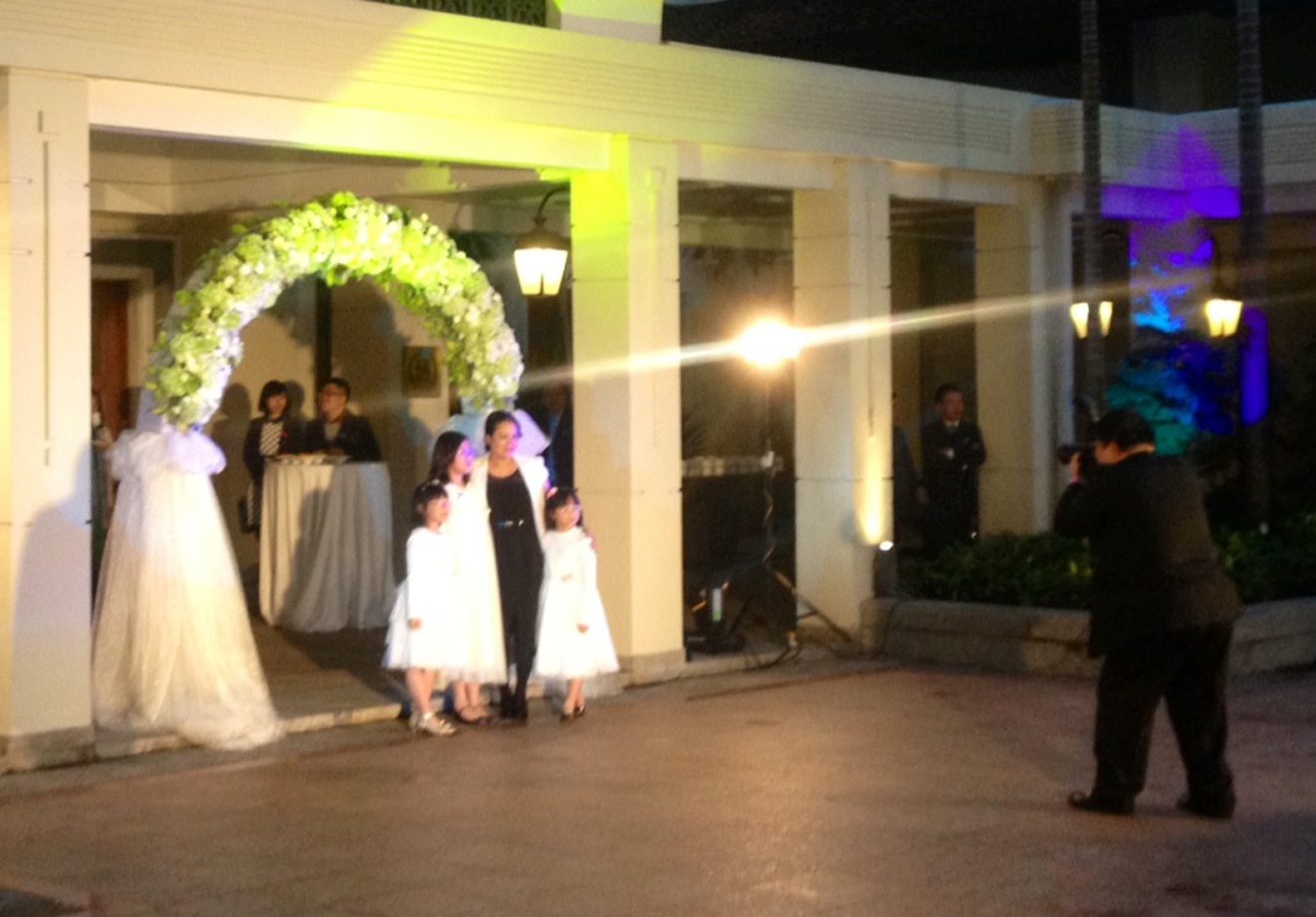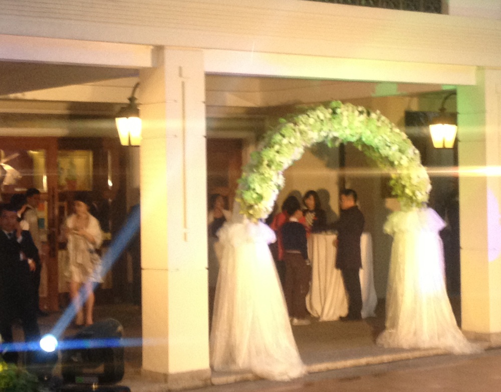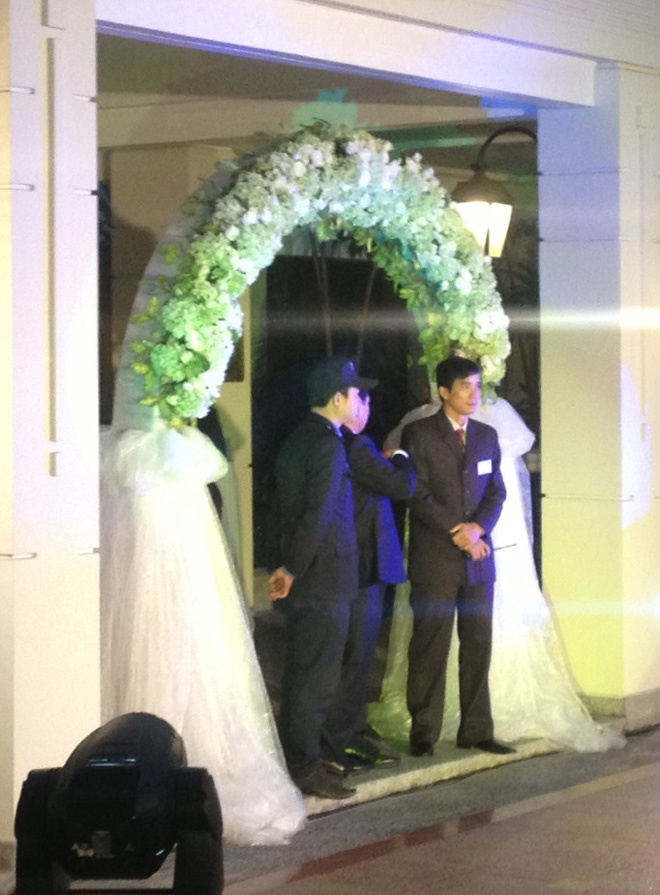 Cổng hoa của tiệc cưới gồm 2 màu trắng và xanh rất nhẹ nhàng, dễ thương. Từ hơn 17h, quan khách lần lượt có mặt dù theo tiệp mời, 18h hôn lễ mới chính thức bắt đầu.