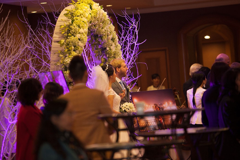 Phòng tiệc được trang trí sang trọng, với những tấm ảnh cưới đẹp lung linh của cô dâu, chú rể.