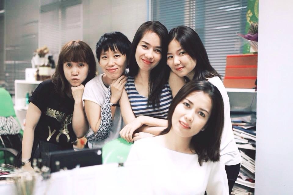 | Ngô Quỳnh Anh rạng rỡ bên bạn bè đồng nghiệp trước bữa tiệc cuối năm. |