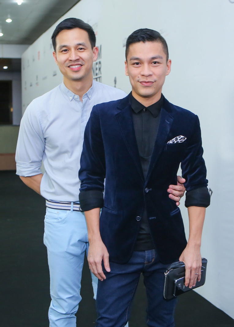 | Nhà thiết kế Adrian Anh Tuấn và bạn đời Sơn Đoàn thân thiết bên nhau. |