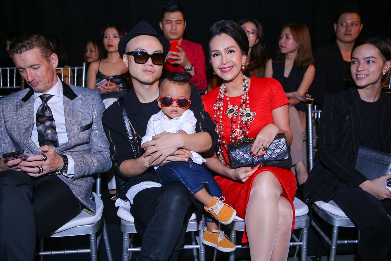 | Cựu giám khảo Vietnam's Next Top Model đưa con trai nuôi đi sự kiện. Câu nhóc ăn vận sành điệu không kém cạnh bố nuôi. Nữ hoàng ảnh lịch Diễm My chọn đầm màu cam cùng chuỗi hạt Chanel quen thuộc. |