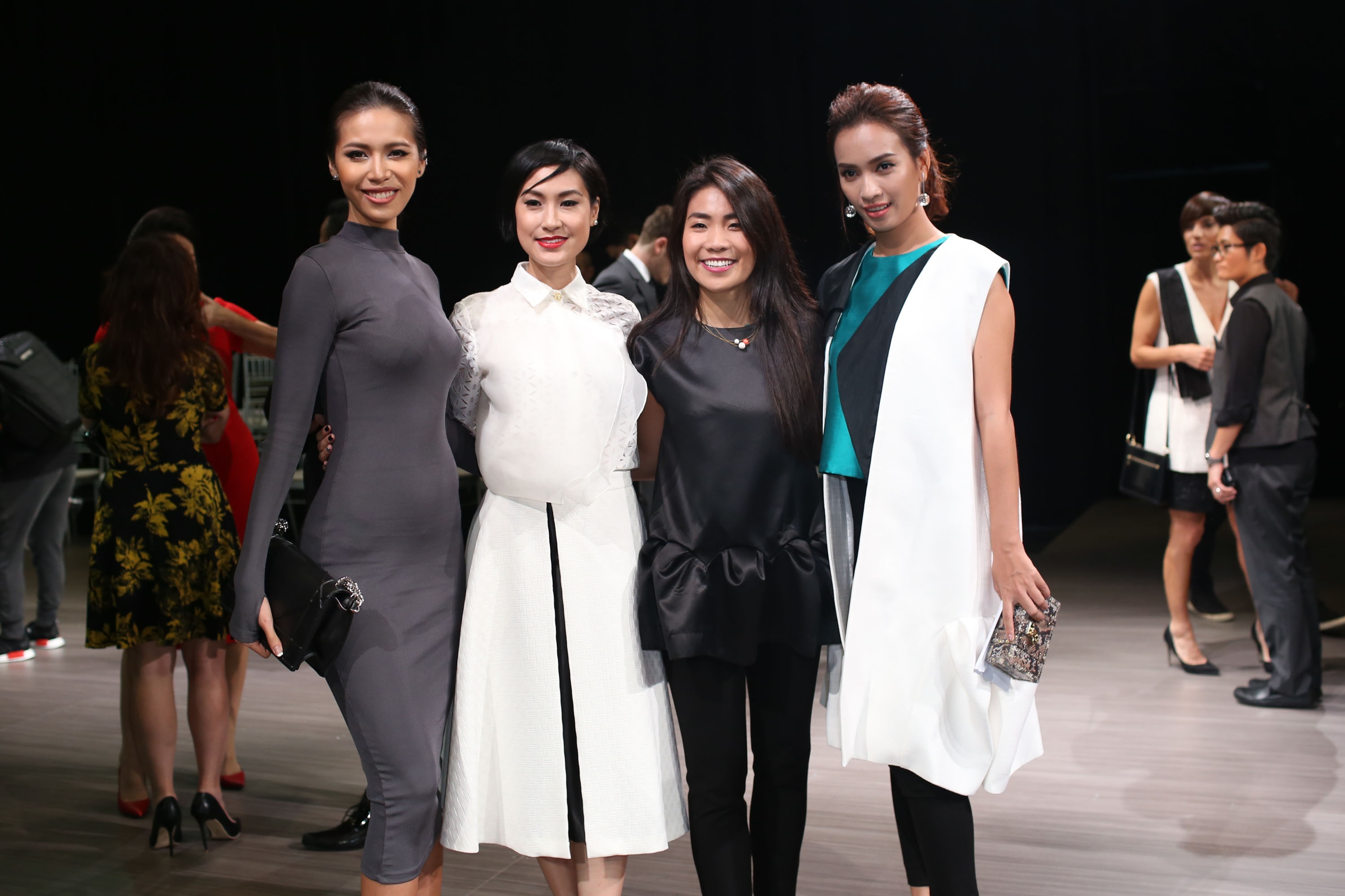 | Minh Tú, Kathy Uyên và Ái Phương chụp ảnh kỷ niệm cùng NTK Anna Võ sau phần trình diễn giới thiệu bộ sưu tập mới. |