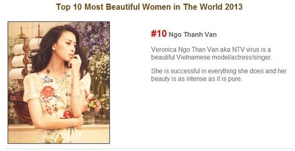 Mới đây, trang web World Actuality công bố danh sách 50 người đẹp nhất thế giới năm 2013. Ngô Thanh Vân là cái tên duy nhất của Việt Nam lọt vào top này và xếp ở vị trí thứ 10.