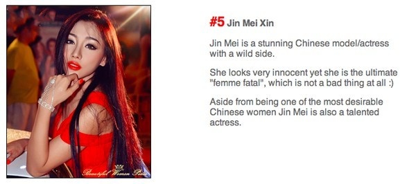 Ngoài ra, nữ diễn viên xinh đẹp Jin Mei Xin của Trung Quốc là đại diện đến từ châu Á có thứ hạng cao nhất trong top 50, khi "cán đích" ở vị trí thứ 5.