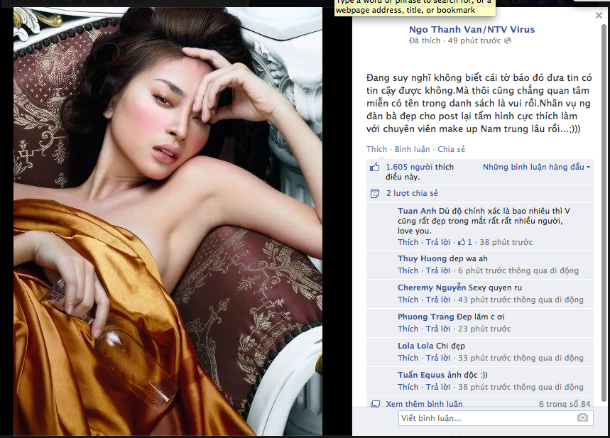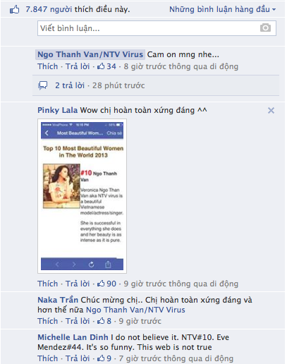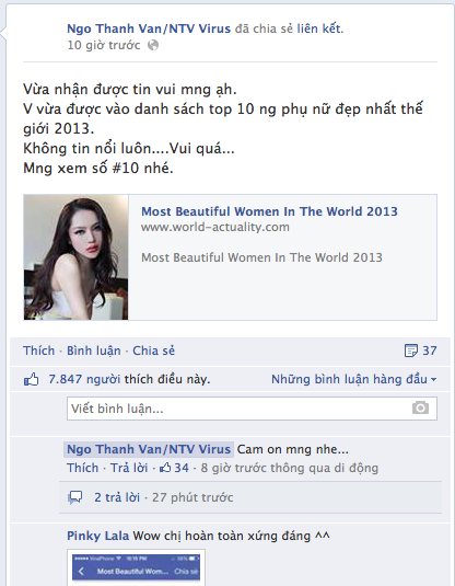 Ngay khi nhận được thông tin, Ngô Thanh Vân đã có những chia sẻ trên trang cá nhân. Cô hào hứng khoe với các fan về việc đứng thứ 10 trong top 50 Người phụ nữ đẹp nhất thế giới 2013. Dù cho biết chưa xác định được nguồn chính thức và độ tin cậy của bảng xếp hạng, song Ngô Thanh Vân rất vui vẻ trước thông tin này.
