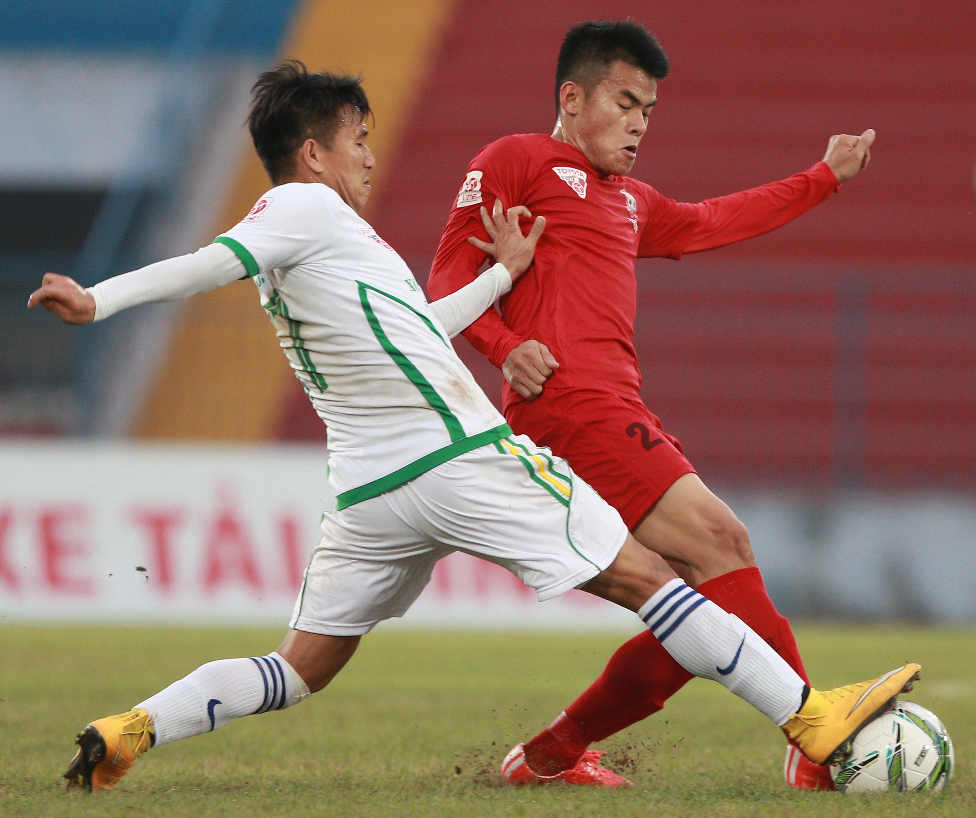 Quang Tình (áo trắng) đội trưởng của SLNA mùa trước tranh chấp quyết liệt với hậu vệ Anh Hùng cũng là một cựu cầu thủ SLNA.