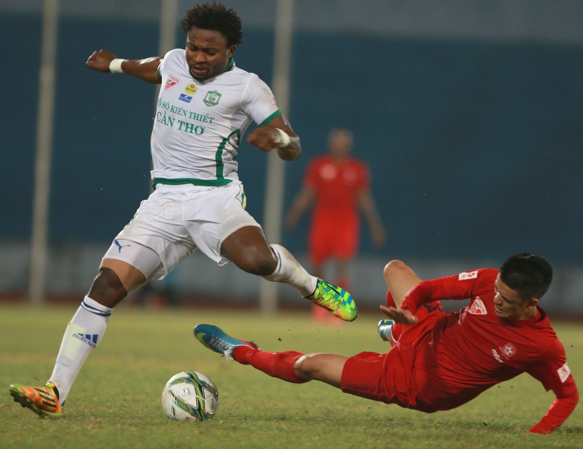 Cặp ngoại binh Patiyo (10) và Oseni của Cần Thơ thi đấu năng nổ và thể hiện nền tảng thể lực vượt trội. Tuy nhiên, họ gặp khó khăn trong việc tìm đường tiếp cận khung thành thủ môn Xuân Việt.