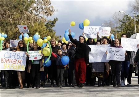 | Người dân giương cao biểu ngữ trong một cuộc biểu tình phản đối chiến tranh tại thị trấn Bakhchisaray, Crimea hôm 5/3. Ảnh: Reuters |