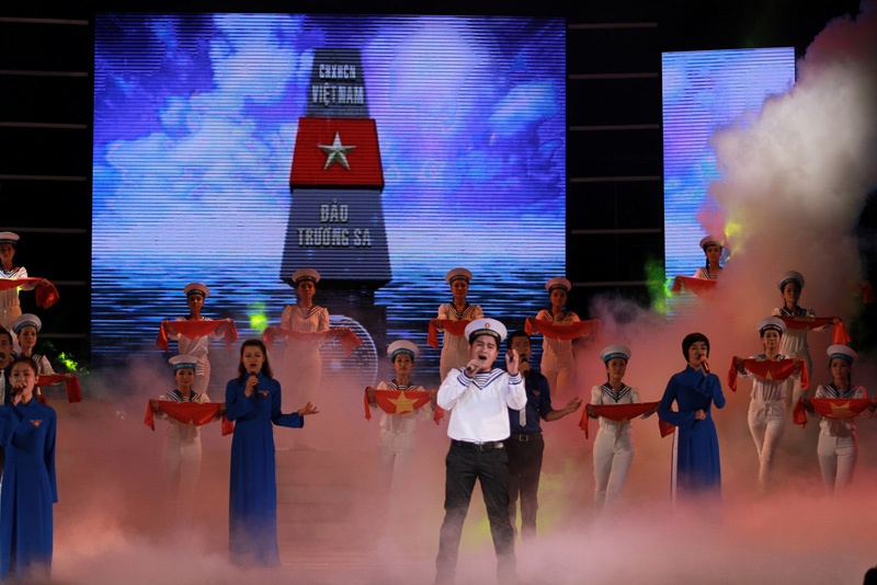 Cả sân khấu bừng cháy với ca khúc Tổ quốc gọi tên mình do Duy Linh, nhóm Giai Điệu Xanh và vũ đoàn Rex biểu diễn.