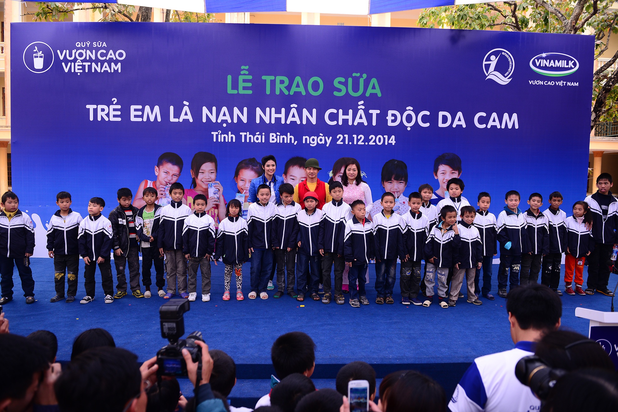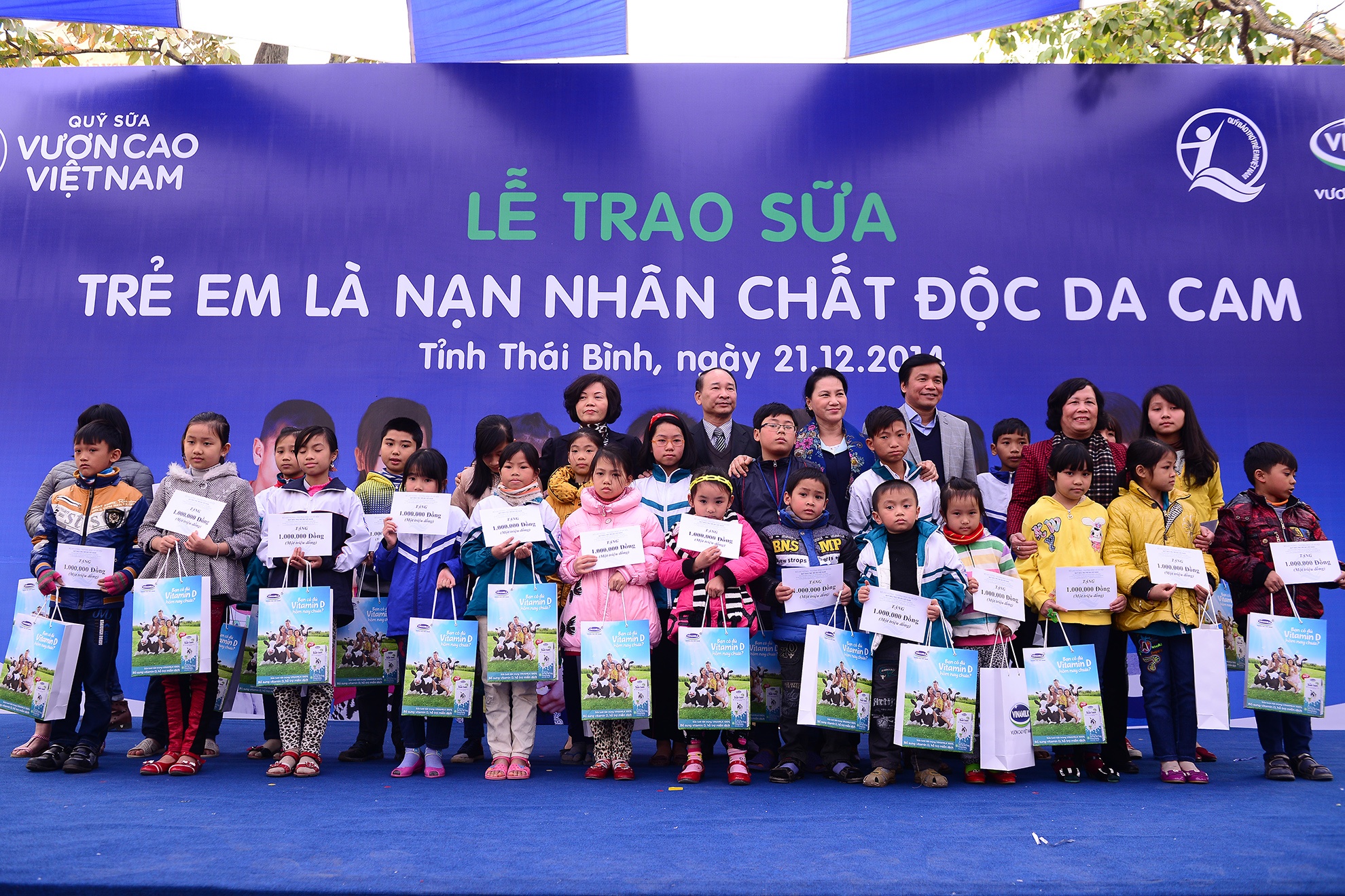 | Bà Nguyễn Thị Kim Ngân, Phó chủ tịch Quốc hội cùng đại diện Quỹ sữa đã trao 54.000 ly sữa và 50 suất học bổng cho trẻ em nhiễm chất độc da cam. Số sữa này tương đương 500 triệu đồng sẽ chuyển trực tiếp đến các trường và trung tâm nuôi dạy trẻ khuyết tật và các gia đình có trẻ em bị ảnh hưởng bởi chất độc màu da cam tại 8 huyện, thị của tỉnh Thái Bình để các em nhỏ sử dụng liên tục trong 3 tháng. |