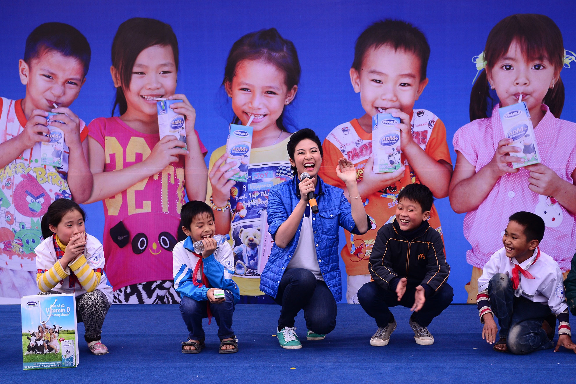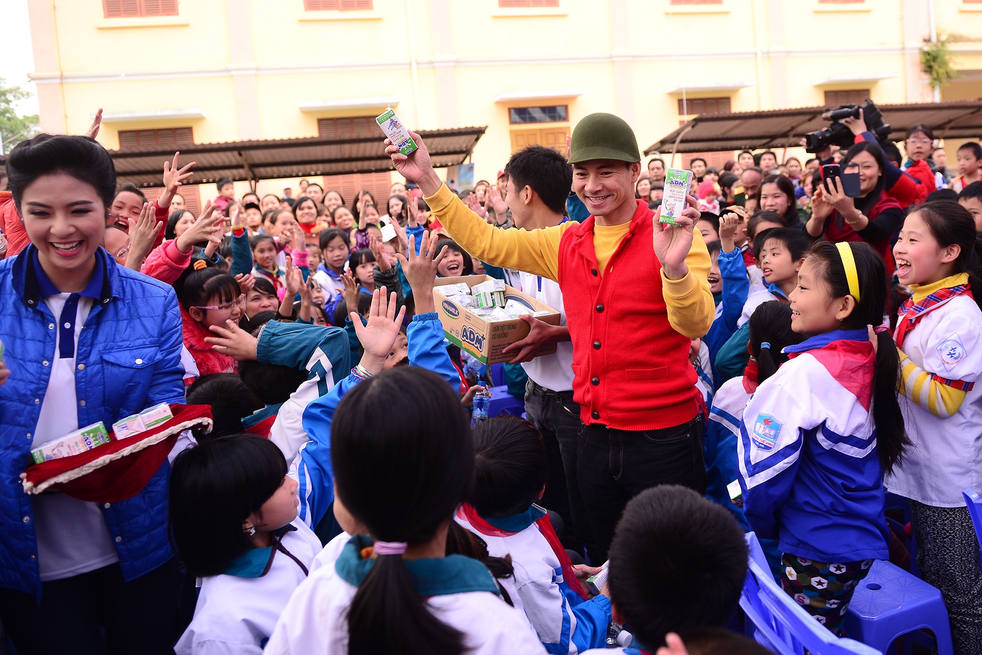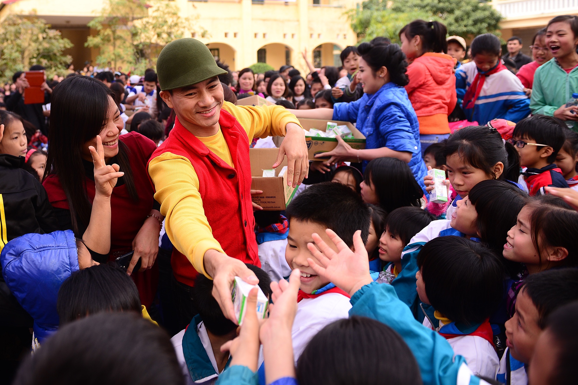 | Đại sứ của Quỹ sữa 'Vươn cao Việt Nam' vận trang phục giản dị xuống tận nơi trao từng hộp sữa cho các em nhỏ. |