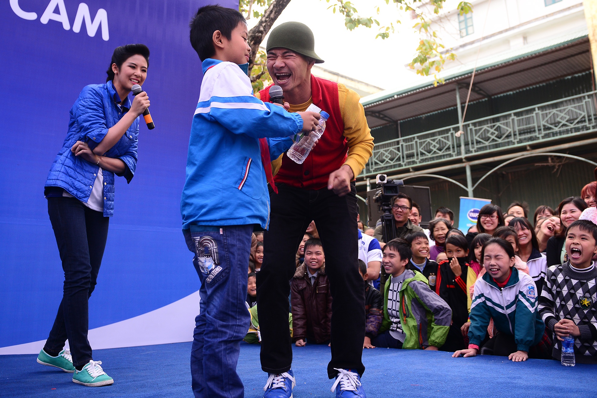 | Các em học sinh cũng đã có cơ hội được giao lưu, tham gia các trò chơi cùng hai Đại sứ của chương trình trên sân khấu. |