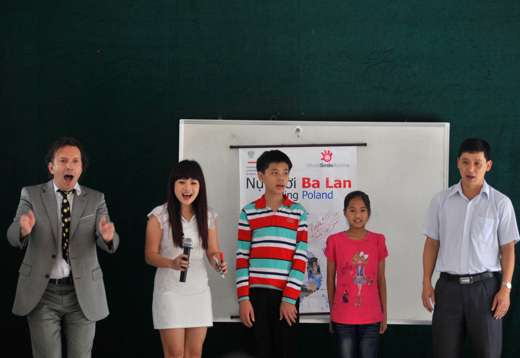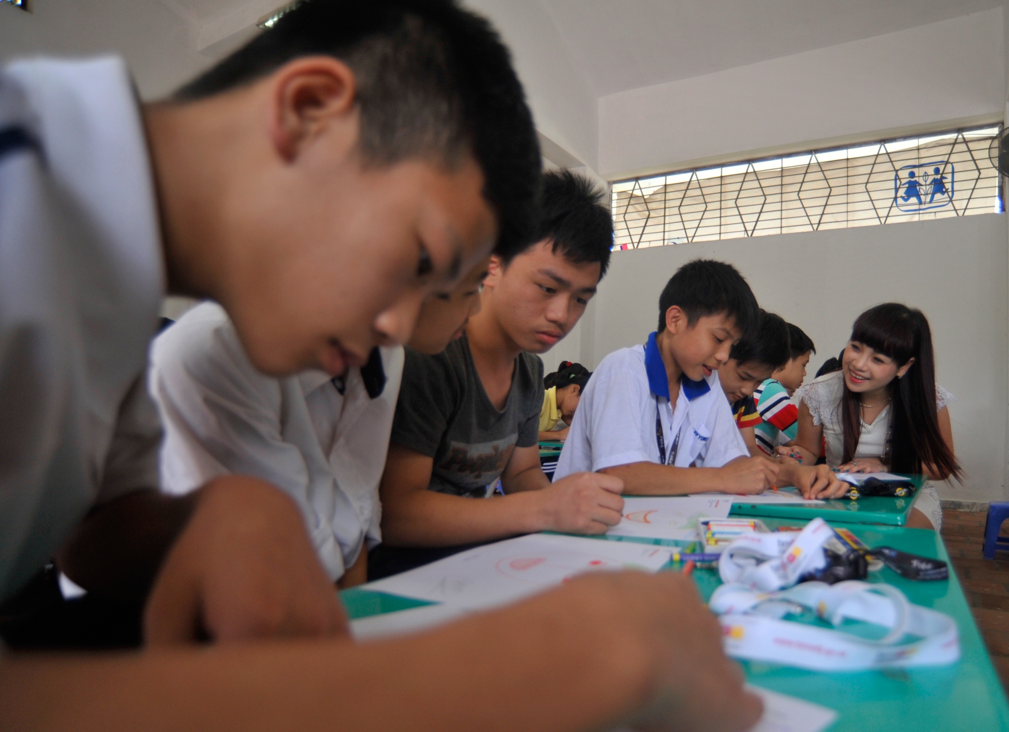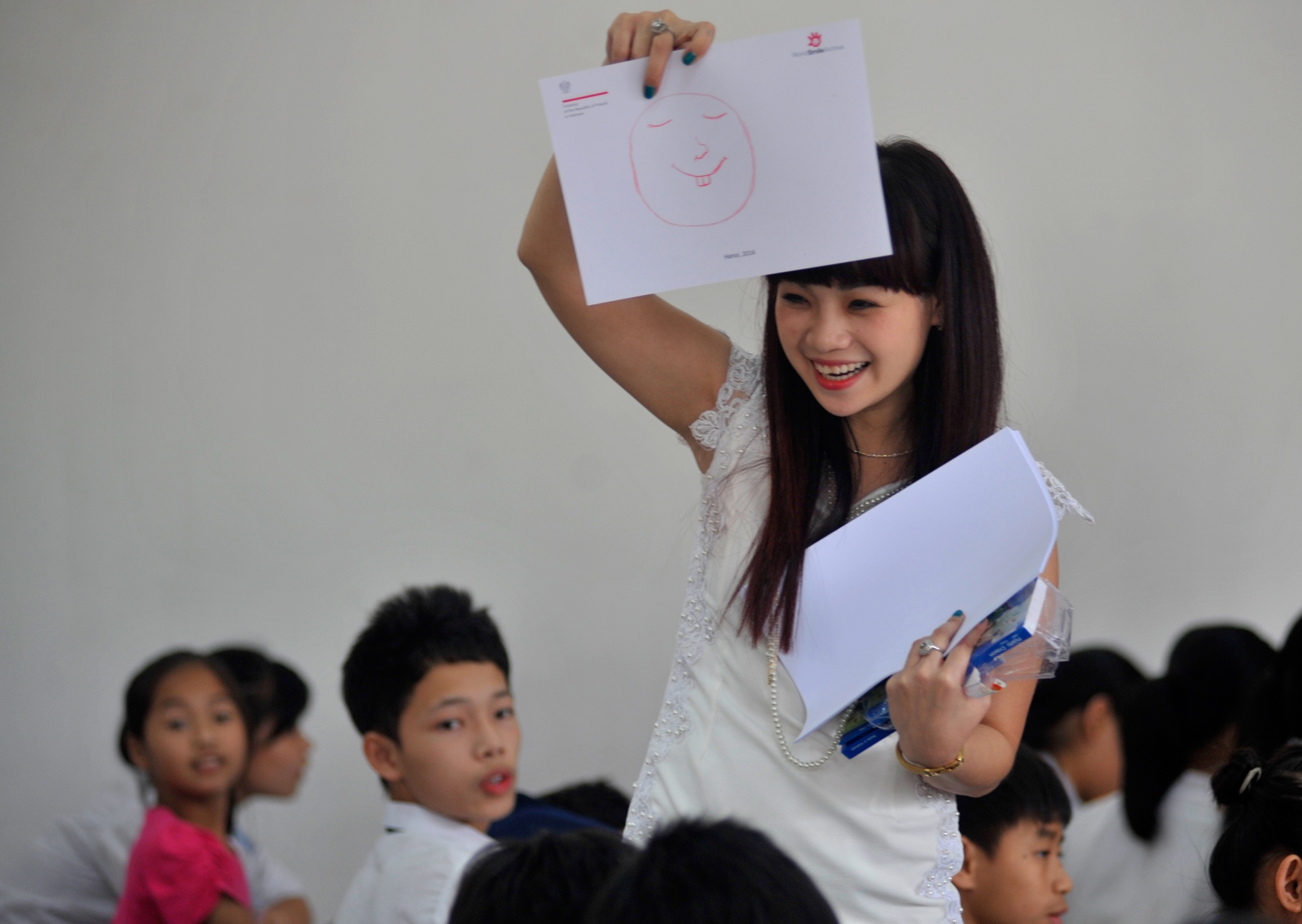 | Ngọc Khuê cùng các em nhỏ vẽ những bức tranh hình nụ cười để gửi thông điệp này tới nhiều trẻ em trên khắp các châu lục. |