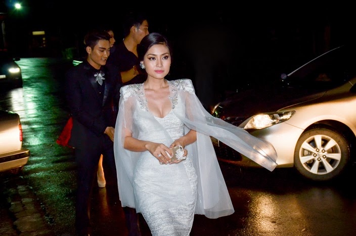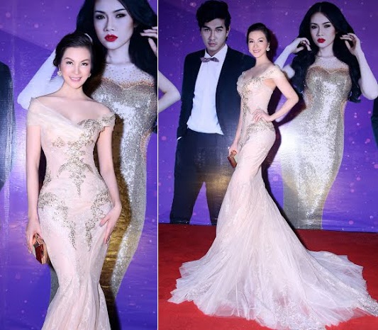 | Ngọc Lan nổi bật và sang trọng với váy trắng ôm sát, phần cầu vai thêu hoa và đính voan cách điệu. Đây là sản phẩm được nhà thiết kế Anh Thư dành riêng cho nữ diễn viên xinh đẹp. |
