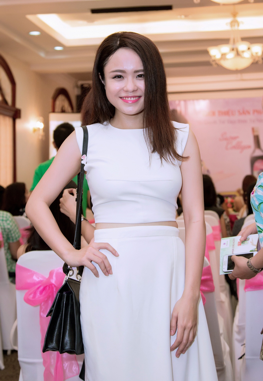 | Ca sĩ Thái Trinh chọn phong cách đơn giản với áo crop-top kết hợp ăn ý chân váy đồng màu. |