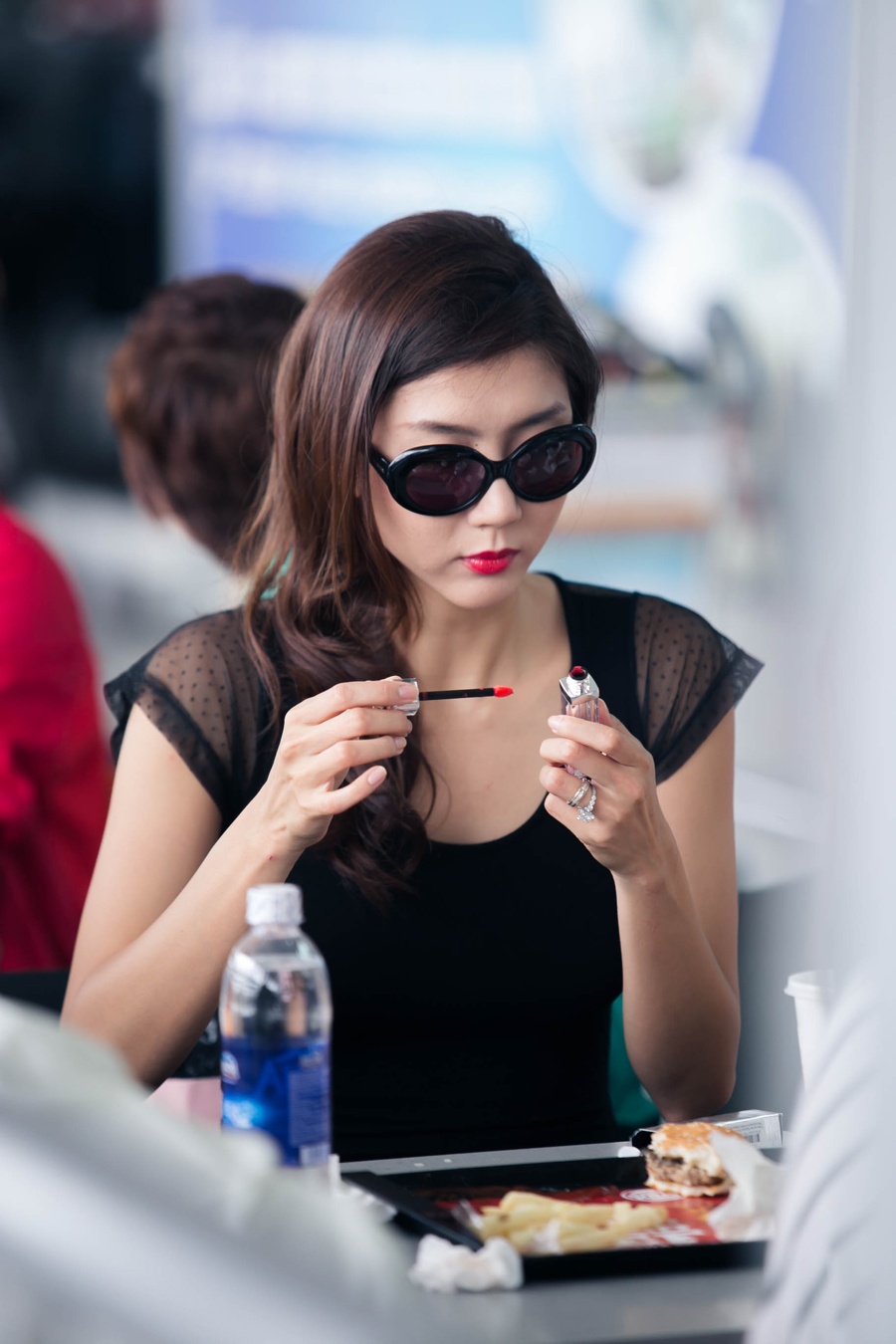 | Người đẹp dùng bữa nhẹ trước giờ bay và không quên trang điểm cho gương mặt tươi tắn. |